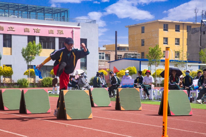 宁夏特殊教育学校庆祝建党100周年暨第四届文化体育艺术节系列活动之一——春季运动会在于成义校长响亮的开幕声中开始了紧张激烈的比赛。比赛中,同学们各个奋勇争先,顽强拼搏。瞧!红色的塑胶跑道上,英姿勃发的运动键儿如一匹匹脱缰的野马,似一支支离弦的箭,飞一般地向终点冲去,去摘取胜利的桂冠。豆大的汗珠从运动健儿们的额头上滑落下来,他们来不及擦,全神贯注地投入到比赛之中。听!激情四射的音乐一刻不停地响着,优秀的广播稿一篇接一篇地播着,赛场上更有同学们的呐喊助威,鼓劲加油,融合成了一支雄壮的催人奋进的乐曲。